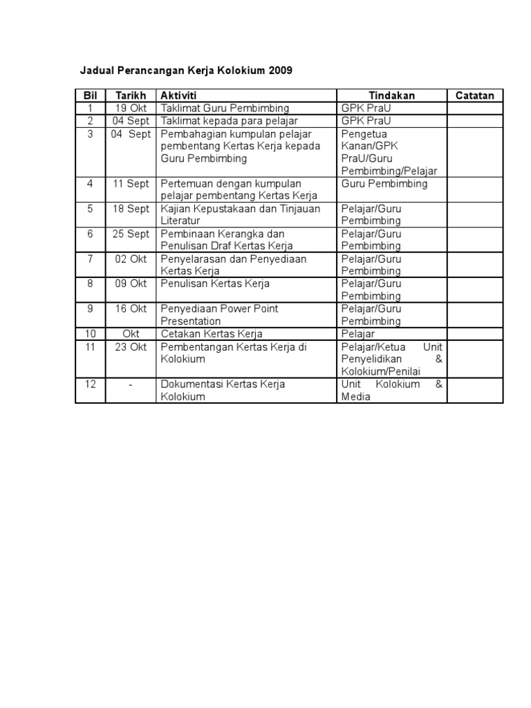 Jadual Perancangan Kerja Kolokium 2009 Pdf