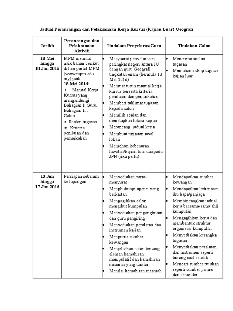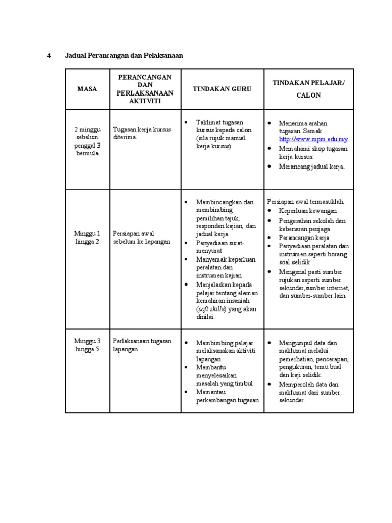Jadual Perancangan Dan Pelaksanaan Kerja Kursus Pdf
